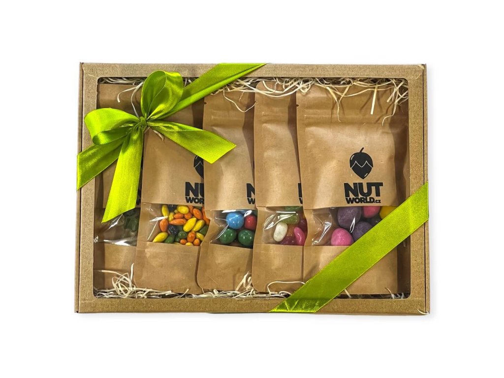 Összetevők: 5x 100g (Mandula színes kéregben, napraforgó színes kéregben, sárgabarack epres joghurtban, cukormentes mackó, zselés cukorka.