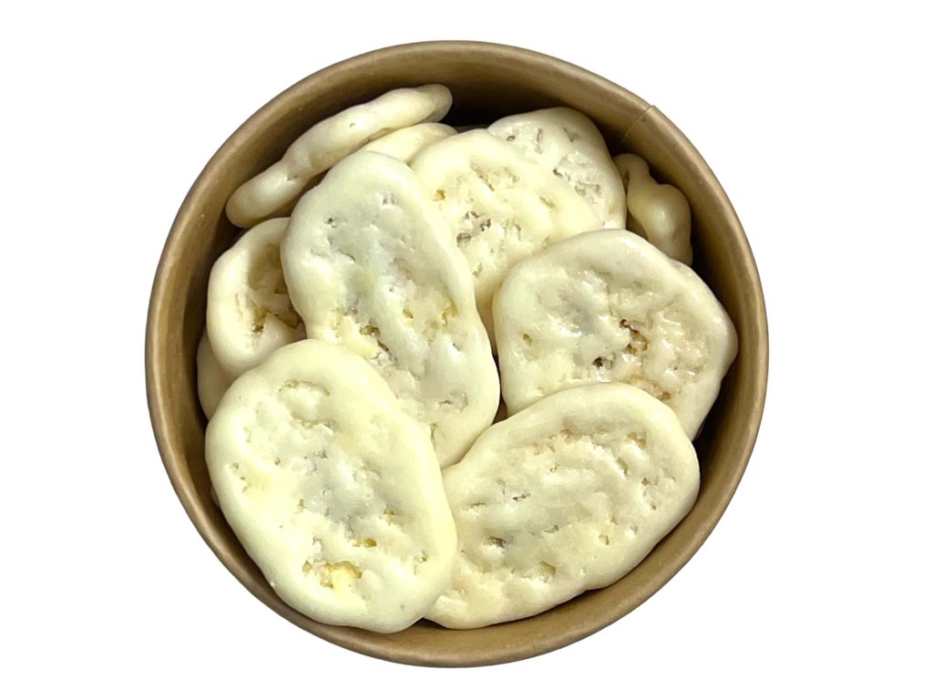Összetevők: BANÁNA szárítva 26% (kén-dioxid és szulfitok E220 0,01%),joghurtos feltét 74% (cukor, növényi zsiradék pálma, ZABPALMA (TEJ), rizsliszt, JOGHURTPOR (TEJ) 3%, emulgeálószer: napraforgó lecitin, fényesítők: gumiarábikum, sellak)
