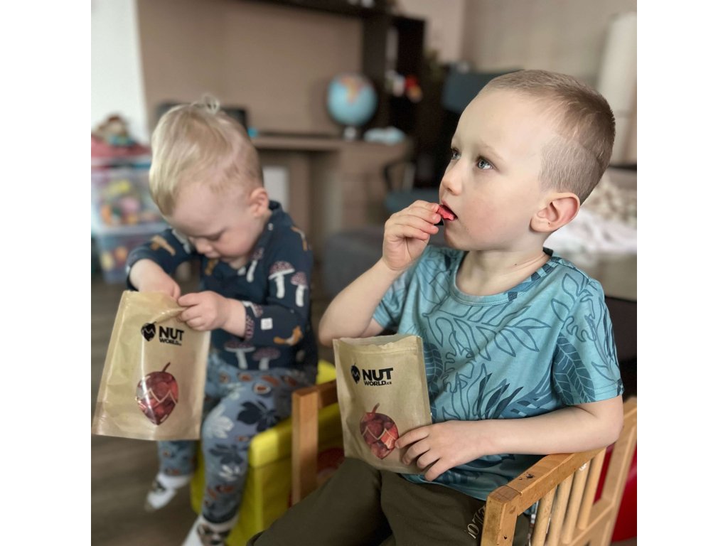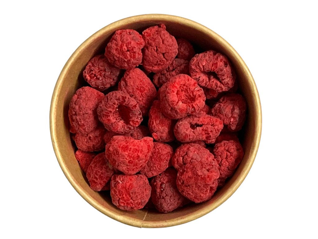 A nagyon alacsony nyomáson végzett mélyfagyasztva szárított gyümölcs megőrzi a maximális vitaminokat, ásványi anyagokat és egyéb tápanyagokat, íze és illata pedig olyan, mint a friss gyümölcsé, így egész évben élvezheti a nyári naptól illatozó málnát.
