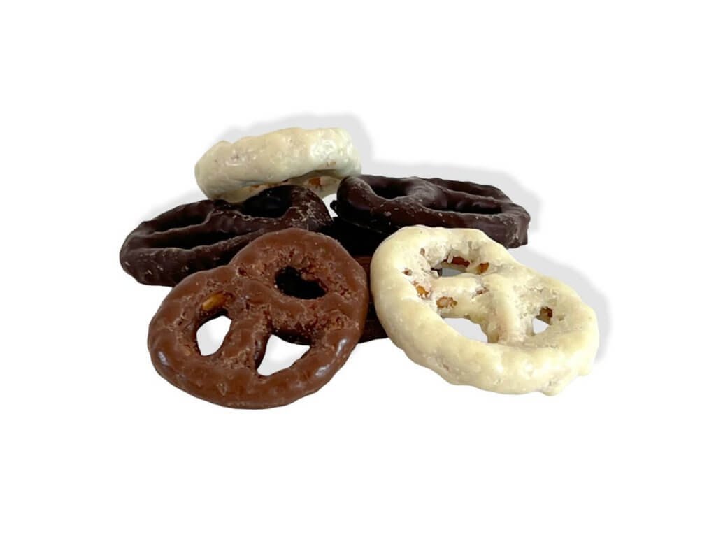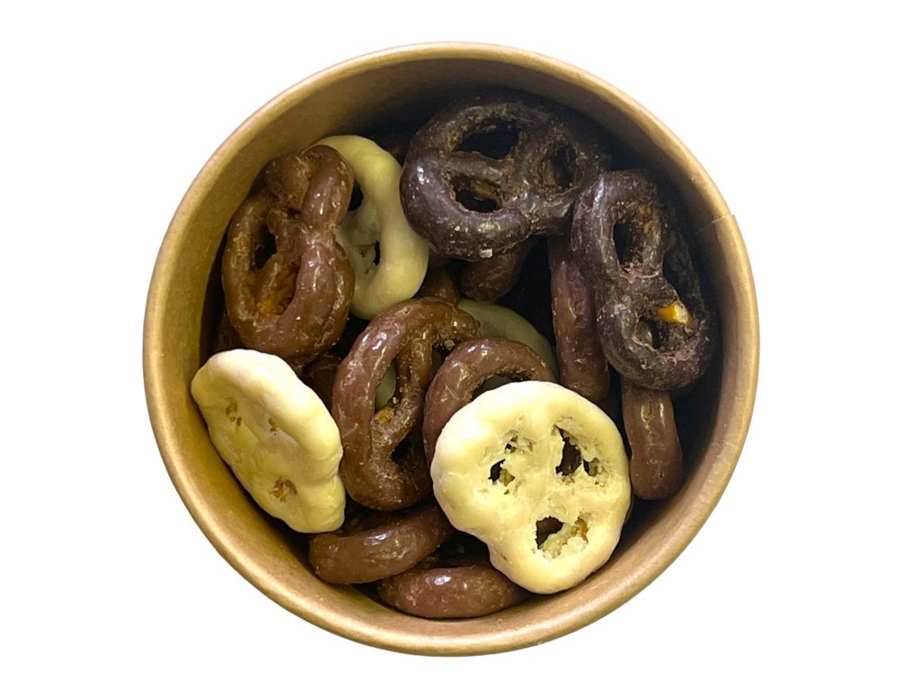 ÖSSZETEVŐK:TEJCSOKOLÁD: 59 % ± 3 % - cukor, kakaóvaj, szárított TEJ, kakaómassza, növényi zsírok (pálmaolaj, vajdióolaj), TEJzsír, szárított SYROW, emulgeálószerek: természetes vanília aroma, perec sózva 40 % ± 3 % - kukoricaliszt, repceolaj, konyhasó 2,3 %, tengeri só 1,2 %, savanyúságot szabályozó anyag: nátrium-hidroxid; élesztő, Dió malátakivonat, kelesztőanyag: nátrium-bikarbonát, fényezőanyag: tápióka-keményítő, cukor, fényezőanyag: sellak. Étcsokoládé: 50% (cukor, kakaómassza, kakaóvaj, emulgeálószer szójalecitin E322, természetes vanília aroma, perec 50% ( búzaliszt, só, napraforgó növényi olaj, élesztő, búzamaláta liszt, savanyúságot szabályozó anyag E524).FEHÉRCSOKOLÁD: 66 % ± 3 % - cukor, kakaóvaj, szárított TEJ, szárított TEJ, emulgeálószer: lecitin; természetes vanília aroma. Sós perec 33 % ± 3 % - BÚZA liszt, repceolaj, só 2,3 %, tengeri só 1,2 %, savanyúságot szabályozó anyag: nátrium-hidroxid; élesztő, diós malátakivonat, kelesztőanyag: nátrium-hidrogénkarbonát. Polírozószer - tápióka keményítő, cukor, polírozószer: sellak.